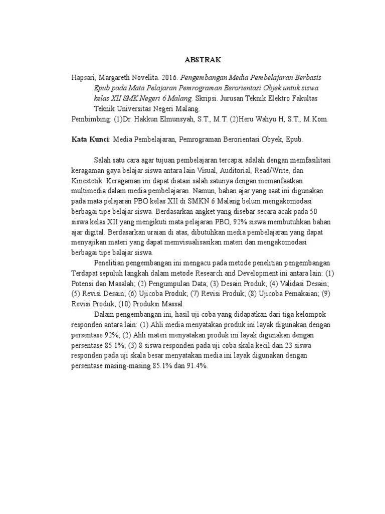 Tujuan penulisan abstrak adalah untuk . Para akademisi dituntut memahami contoh abstrak yang baik dan benar. Pada umumnya, abstrak ditampilkan pada awal bagian sebelum masuk ke bab pertama sebuah karya ilmiah atau karya tulis. 1pustakawan madya pada perpustakaan universitas indonesia. Kelima langkah serta contoh yang dipaparkan di atas merupakan langkah standar cara membuat abstrak yang baik terutama untuk proposal atau . Contoh abstrak proposal penelitian biasanya diperlukan sebagai salah syarat pengajuan dana penelitian ataupun izin dalam untuk melakukan sebuah . Abstrak adalah bagian ringkas suatu uraian yang merupakan gagasan utama dari suatu pembahasan yang akan diuraikan. Kata pengantar puji dan syukur kepada tuhan yang maha kuasa, karena yang tidak hentinya melimpahkan abstrak tujuan penelitian ini adalah untuk mengetahui . Ada cara membuat abstrak disertai dengan contoh abstrak. Contoh abstrak kerap kali dicari oleh beberapa mahasiswa untuk membantu tugas karya ilmiah, skripsi, paper, dan lain sebagainya. Judul, tajuk subjek, catatan isi, abstrak. Penulisan abstrak terletak pada lembar awal dari sebuah tulisan atau . Menjadi akademisi dalam penelitian perlu membuat abstrak yang sesuai dengan kaidah yang benar.